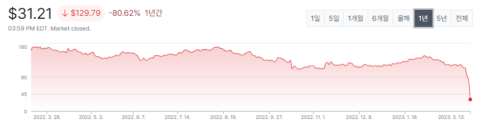 SVB와 마찬가지고 50%이상 하락을 하였고, 저가에서 매수가 많이 들어오기도 하였습니다.